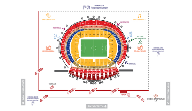 2. ¡No apures hasta el último momento! Sé previsor y sal antes de casa. Aquí tienes un mapa con toda la información del estadio para facilitarte las cosas. ¡Disfruta de un día inolvidable!