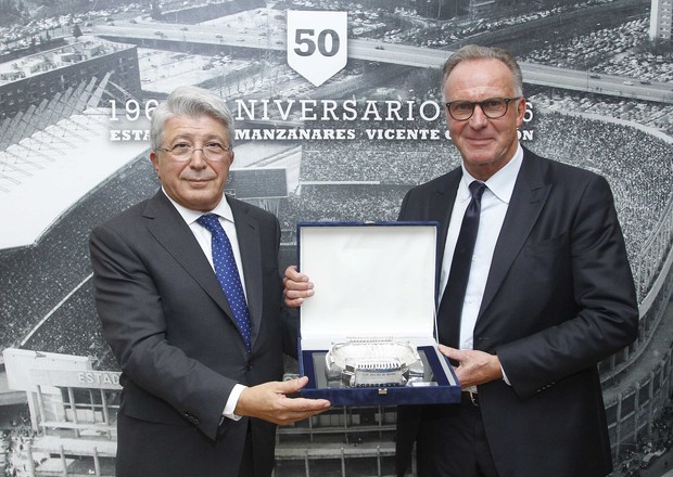 Durante el descanso del choque que nos midió al Bayern Munich, Enrique Cerezo, presidente del Atlético de Madrid, hizo entrega a Rummenigge de una réplica en miniatura del estadio Vicente Calderón, con motivo de la última temporada de nuestro estadio.