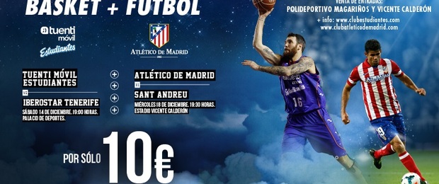 Tuenti Móvil Estudiantes y el Club Atlético de Madrid lanzan el Pack ‘Basket + Fútbol’ por 10 euros, que incluye una entrada para el partido Tuenti Móvil Estudiantes - Iberostar Tenerife de Liga Endesa del sábado 14 de diciembre a las 19:00h en el Palacio de Deportes y el Atlético de Madrid- Sant Andreu de Copa del Rey del miércoles 18 de diciembre a las 19:30h en el Estadio Vicente Calderón. ¡Solo en oficinas de ambos clubes!