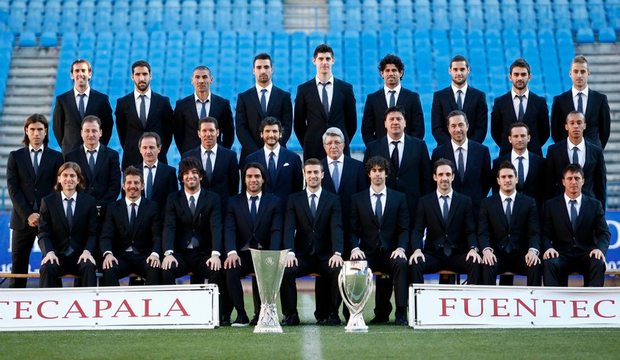 Los jugadores del Atlético de Madrid han vestido de Fuentecapala en dos de los momentos más decisivos del 2012 como son la Final de la UEFA Europa League y la Final de la Supercopa. En ambas ocasiones, los pupilos de Diego Pablo Simeone lucieron su traje oficial compuesto por un traje negro ‘Slim Fit’ en Pura Lana Merino de hilaturas Super 120’s; camisa Slim blanca de popeline de algodón elástico natural; corbata estrecha de seda natural negra con diseño en espiga; abrigo deportivo negro acolchado en pluma con capucha rematada en piel; cinturón y zapato de vestir negros en piel nobuck y Foulard en espiga gris melange.