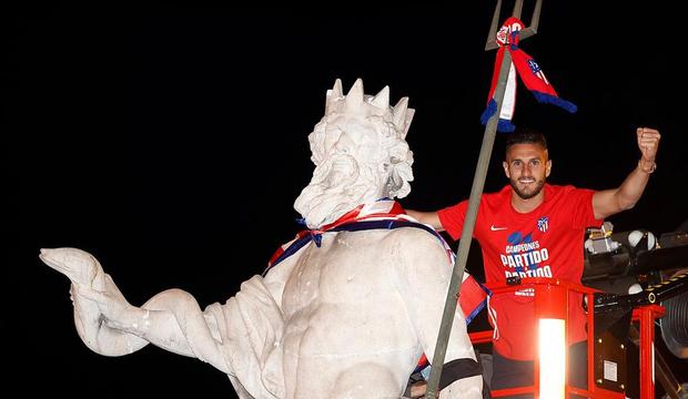 El capitán rojiblanco, Jorge Resurrección 'Koke' cumplió con la tradición de colocar a Neptuno una bufanda y una bandera rojiblancas tras conseguir el título como campeones de Laliga.