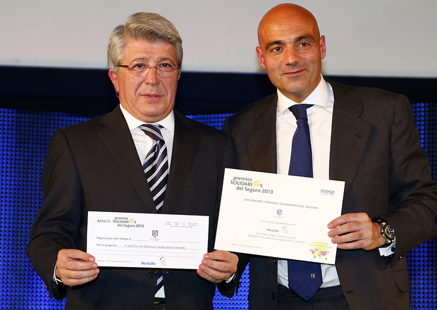 Metlife, patrocinador de la Academia del Club Atlético de Madrid, realizó este martes 19 de noviembre una aportación económica a la Fundación Atlético de Madrid para la financiación de sus escuelas de tecnificación. La donación se produjo durante la celebración de los ‘Premios Solidarios del Seguro’, que ya alcanzan su décimo tercera edición, en presencia de Enrique Cerezo, Adelardo Rodríguez y Germán Robles, presidentes del Club y de la Fundación, y director de esta última respectivamente. Tampoco faltó Óscar Herencia, director general de Metlife en España, encargado de entregar el cheque nominativo al dirigente de la entidad.