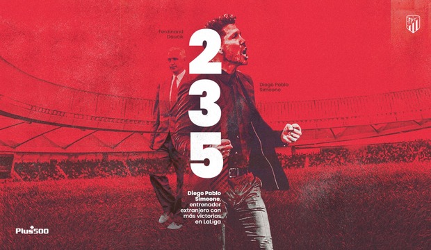 Diego Pablo Simeone continúa haciendo historia en el Atlético de Madrid. El argentino logró, ante el Getafe Club de Fútbol, su victoria número 235 en LaLiga como técnico, lo que le convierte en el preparador extranjero con más triunfos en la historia de la competición. Nuestro entrenador alcanza este reconocimiento superando al histórico técnico Ferdinand Daucik, quien ocupó el banquillo de nuestro Atleti entre los años 1957 y 1960.