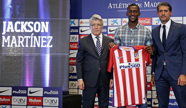 Jackson Martínez ya viste los colores del Atlético de Madrid. El ariete colombiano fue presentado en el estadio Vicente Calderón. El nuevo jugador rojiblanco estuvo acompañado por sus familiares y representantes en un acto de presentación conducido por el presidente, Enrique Cerezo, y en el que también estuvo el director deportivo de la entidad, José Luis Pérez Caminero.