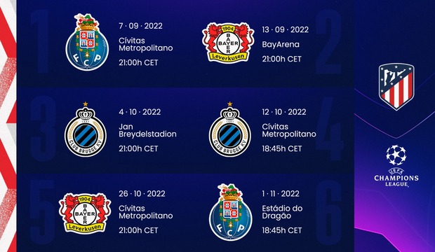 Nuestro equipo ya conoce a sus rivales para la fase de grupos de la UEFA Champions League 2022/23. En la primera ronda de la máxima competición continental estaremos encuadrados en el grupo B, donde nos mediremos al FC Porto, Bayer Leverkusen y Club Brujas.