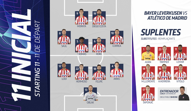 - Once titular del Atlético de Madrid: Oblak, Arias, Felipe, Hermoso, Lodi, Thomas, Saúl, Koke, Correa, Morata y Costa.