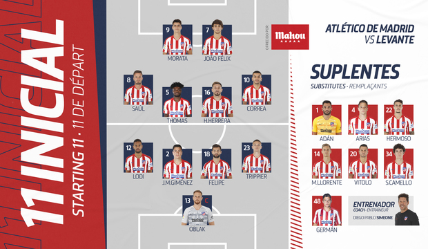 - Once titular del Atlético de Madrid: Oblak, Trippier, Felipe, Giménez, Lodi, Herrera, Thomas, Saúl, Correa, Joao Félix y Morata.