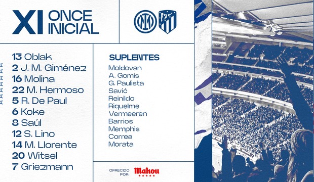 - Once del Atlético de Madrid: Oblak, Molina, Witsel, Giménez, Hermoso, Lino, Koke, De Paul, Saúl, Llorente y Griezmann.
