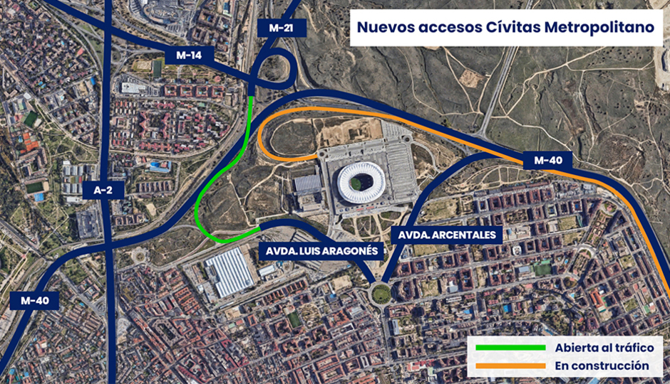 Las obras de mejora de los accesos del Cívitas Metropolitano con la M-40, que están siendo ejecutadas y financiadas íntegramente por el Atlético de Madrid, continúan avanzando a buen ritmo, y confiamos en que estén completamente acabadas antes de que acabe la temporada actual y puedas disfrutar de las nuevas conexiones en los últimos partidos de Liga.