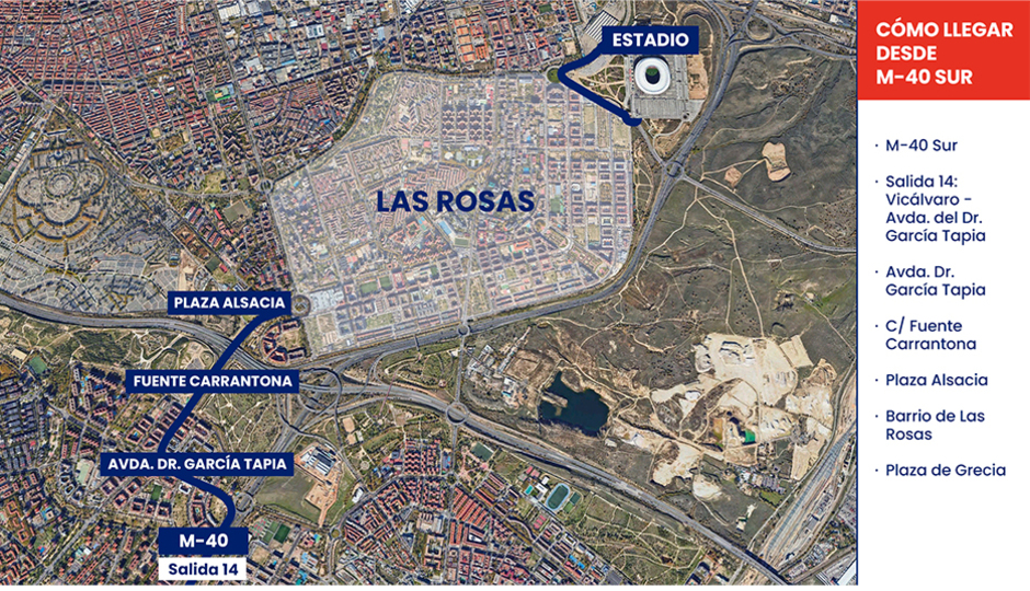 - Desde la M-40 Sur, tomar la salida 14 “Vicálvaro - Avda. del Dr. García Tapia” y desde ahí por la Avenida Dr. García Tapia, calle Fuente Carrantona, Plaza de Alsacia y a través del barrio de Las Rosas hasta la Plaza de Grecia.