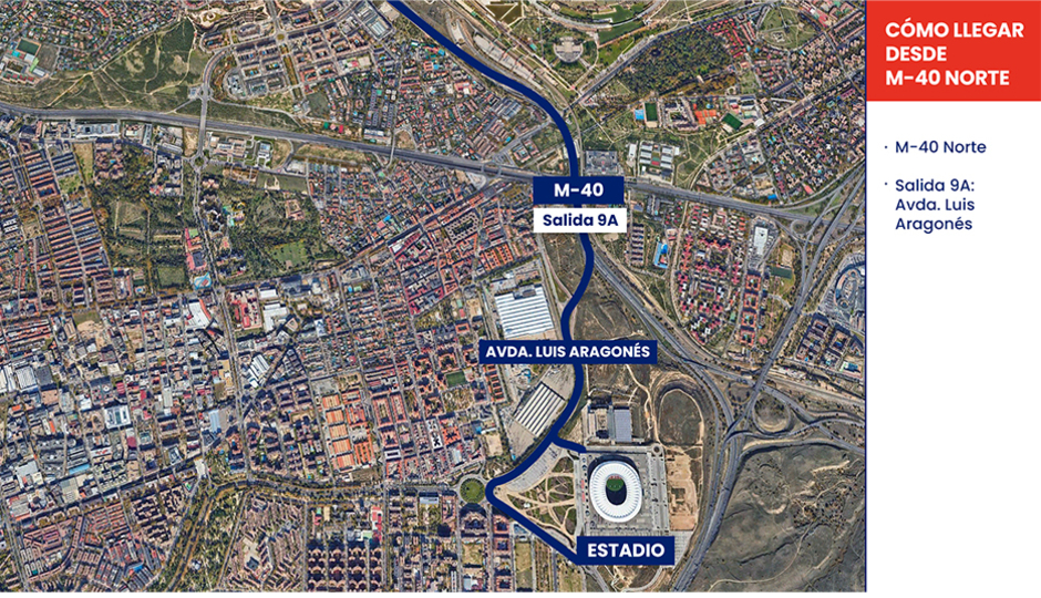 - Desde la M-40 Norte, tomar la salida 9A “Avenida Luis Aragonés”.