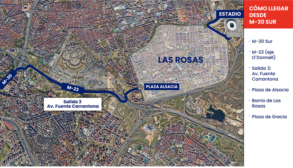 - Desde la M-30 Sur, a través de la M-23 (eje O`Donnell), salida “Fuente Carrantona” y desde ahí a la Plaza de Alsacia y a través del barrio de Las Rosas hasta la Plaza de Grecia.