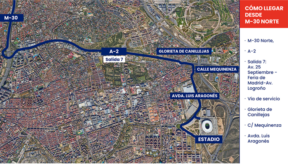 - Desde la M-30 Norte, por la A-2 tomar la salida 7 “Av. 25 Septiembre - Feria de Madrid-Av. Logroño”, continuando por la vía de servicio hacia la calle Alcalá hasta llegar a la glorieta de Canillejas y coger la Avenida Luis Aragonés.