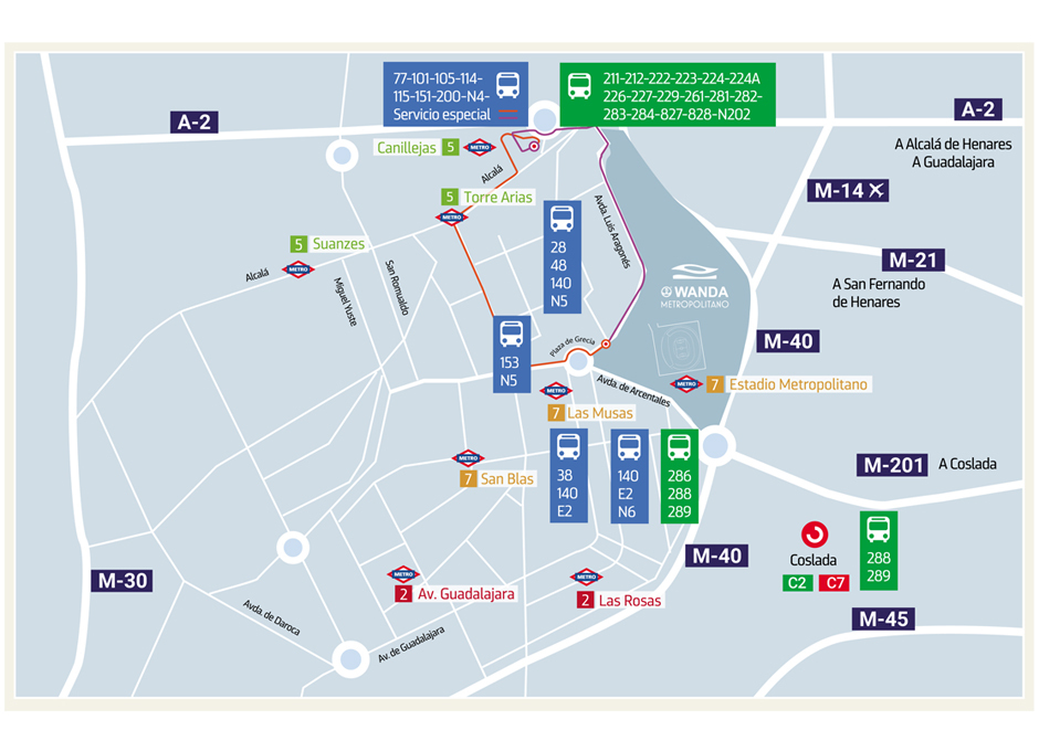 Los aficionados cuentan con diferentes opciones para acudir al Riyadh Air Metropolitano tanto en vehículos particulares como en transporte público. Nuestro nuevo punto de encuentro se sitúa en la zona noreste de Madrid, junto a la M-40 y en el área de influencia del aeropuerto e IFEMA.+