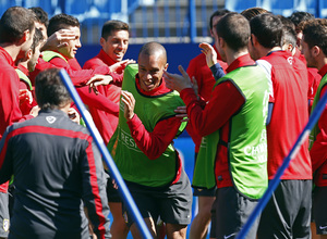 El Atlético de Madrid se entrenó por la mañana en el Estadio Vicente Calderón con la novedad del recuperado Tiago, quien empezó a trabajar el domingo tras la lesión sufrida en Almería.