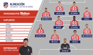 Alineación del Atlético de Madrid: Oblak, Juanfran, Lucas, Savic, Filipe Luis, Koke, Thomas, Saúl, Carrasco, Vietto y Correa.