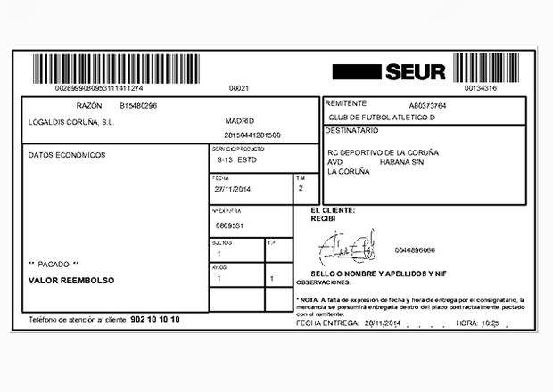 Atendemos su solicitud y el 11 de noviembre se realiza este primer envío de las entradas mediante la empresa de mensajería Seur a la sede del Deportivo de La Coruña situada en la Avenida de La Habana sn y a la atención del citado responsable y del propio club.