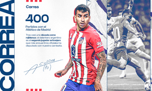 Sería el primero de los 400 que celebra este miércoles y que le convieron en el duodécimo jugador con más encuentros disputados a lo largo de nuestra historia. Si hablamos exclusivamente de jugadores extranjeros, Correa es el segundo atlético que más veces se ha puesto nuestra camiseta. A lo largo casi una década, ha repartido 59 asistencias y anotado 74 goles, dejando para el recuerdo el último que se marcó en el Estadio Vicente Calderón o el 'puntín' en Valladolid sin el cual no hubiéramos ganado LaLiga 2020/21. Un título este último que añadió a un palmarés que ya contaba con la Europa League 2017/18 y la Supercopa de Europa 2018.