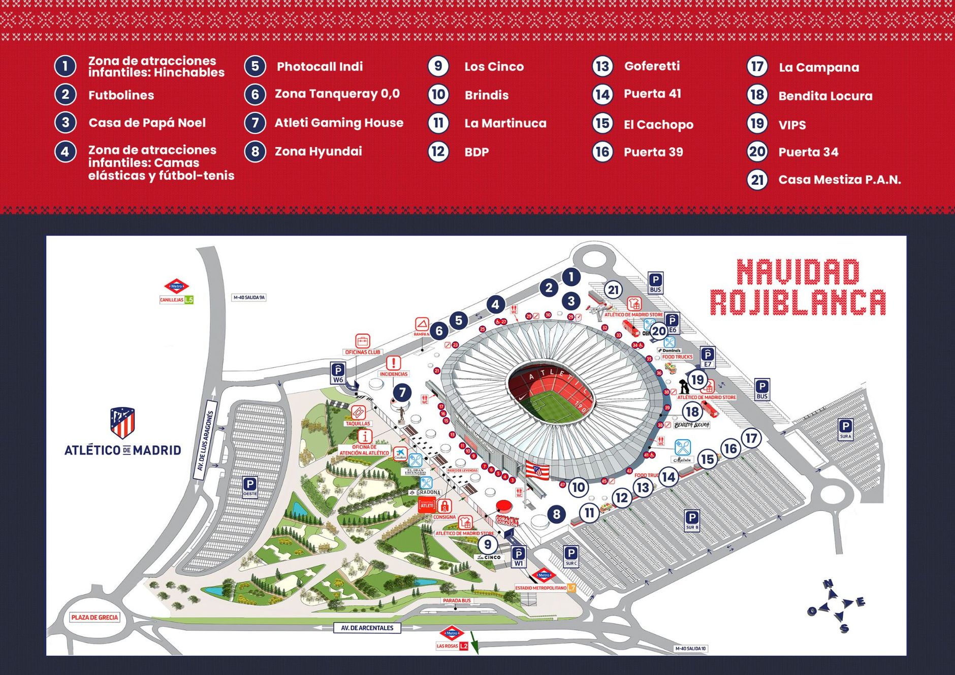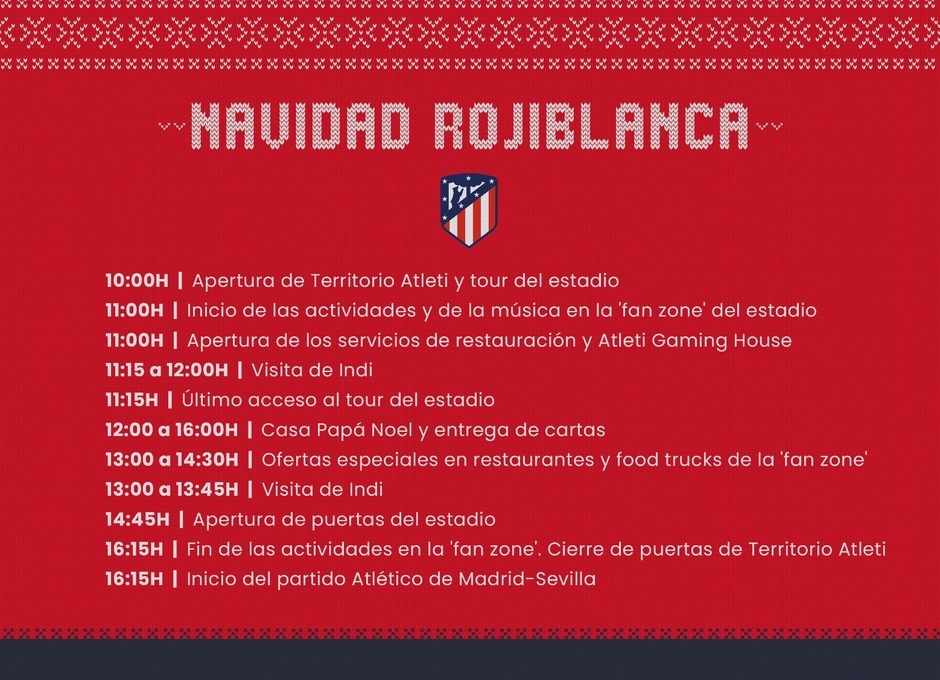 Además, no dejes pasar la oportunidad de conocer la historia de nuestro club en Territorio Atleti, de disfrutar de la zona de videojuegos en la Atleti Gaming House y divertirte en los hinchables de la zona norte. Aprovéchate de ofertas especiales en los restaurantes del estadio y foodtrucks de la fan zone, que contarán con comida y bebida caliente típicas de estas fechas (como caldos, chocolate con churros o roscón).