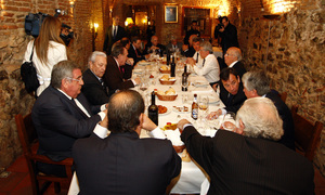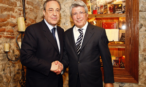 El derbi correspondiente a la jornada 33 de la Liga BBVA entre el Atlético de Madrid y el Real Madrid que se jugará en el estadio Vicente Calderón comenzó con el tradicional almuerzo institucional en el restaurante Capitán Alatriste de la capital.