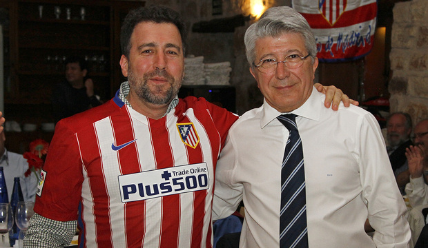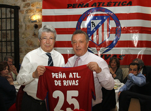 El presidente del Atlético de Madrid, Enrique Cerezo, no se quiso perder la celebración del 25 aniversario de la Peña Rivas. Un acto que contó con la presencia del alcalde de la localidad, Pedro del Cura, y la concejal de deportes.