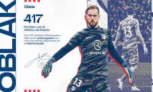 ¡Jan Oblak no deja de hacer historia! En el primer encuentro de este 2024 disputado en Girona, el guardameta ha igualado a Gabi con 417 partidos disputados como atlético, convirtiéndose en el octavo atlético con más encuentros, igual que nuestro canterano.