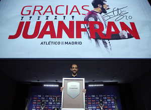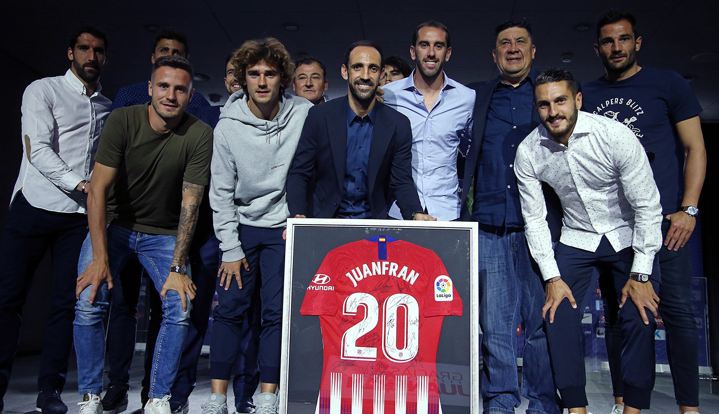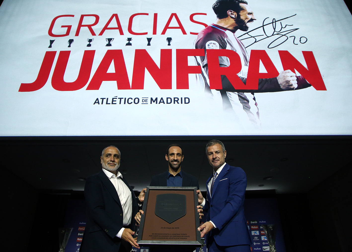 De manos de otros dos referentes históricos del lateral derecho rojiblanco como son Tomás Reñones y Carlos Aguilera, el futbolista de Crevillante recibió una placa conmemorativa de sus 355 partidos como atlético, casi todos ellos ocupando una demarcación que Juanfran descubrió ya como jugador de nuestro club: "Vine como interior, como extremo, y gracias primero a Gregorio Manzano, que junto a su cuerpo técnico decidió que jugara en el lateral; gracias después a Diego, que me enseñó los conceptos defensivos para mejorarlos, y también gracias a mis ganas de querer ser importante, ahí empezó todo lo bueno en el Atlético de Madrid".