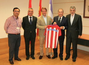 Adelardo Rodríguez le entregó una camiseta rojiblanca al alcalde de Tres Cantos.