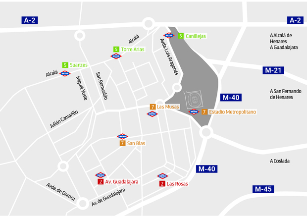 Esta estación se convertirá una referencia en la red de Metro de la Comunidad debido a la gran afluencia de personas que tendrá. Pero no será la única que podrán usar los aficionados para acudir a ver los partidos del Atlético. Las estaciones de Las Musas (Línea 7), Canillejas (Línea 5) y Las Rosas (Línea 2) se encuentran en un radio de 20 minutos a pie hasta nuestro nuevo estadio. Por ello, también la línea 2 y 5 se verán reforzadas con un incremento de entre dos y cuatro trenes más los días de partido. Además, la estación de Canillejas estará conectada con el Wanda Metropolitano gracias a un servicio especial de autobuses. Una línea circular que funcionará desde dos horas antes de cada partido y una hora y media después y en la que circularán autobuses con una frecuencia de cinco minutos.