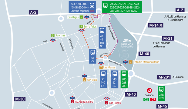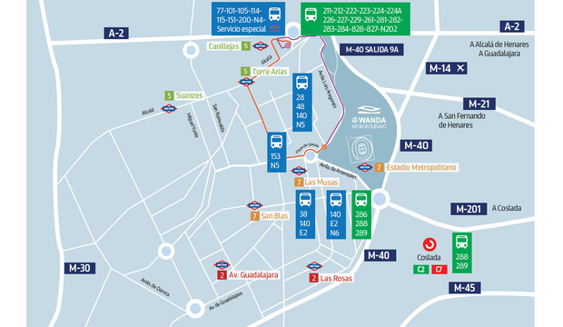 Te recomendamos la utilización del Metro para asistir al Cívitas Metropolitano por su amplitud y cercanía ya que es la forma más cómoda de acudir al estadio. La parada más cercana es la de ‘Estadio Metropolitano’, correspondiente la Línea 7. Pero también puedes llegar desde las estaciones de ‘Las Rosas’ (Línea 2) y ‘Canillejas’ (Línea 5) que se sitúan a un cuarto de hora a pie. Todas ellas reforzarán su frecuencia de trenes y además, la EMT pondrá en marcha desde dos horas antes y hasta 1 hora y media después un servicio especial de autobús que conectará el intercambiador de Canillejas con la Plaza de Grecia, situada frente al estadio. ¡Te esperamos!