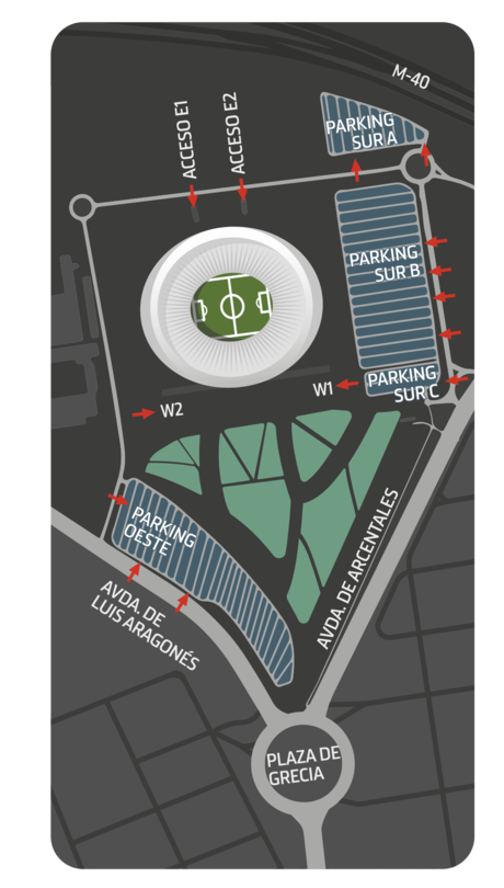 En caso de tener que llegar al estadio en coche, puedes utilizar la salida 9A de la M-40, la salida de Arcentales desde la M-40, la salida 8 de la A-2, la Avenida de Canillejas a Vicálvaro o los amplios bulevares del barrio de Las Rosas.