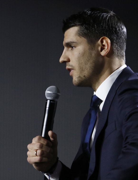 Enrique Cerezo dio la bienvenida a Morata a nuestro club con unas emotivas palabras: "Álvaro, no tengo que explicarte lo que significa vestir la camiseta que ahora te vamos a entregar. Me consta que tu abuelo, que es un gran atlético y al que le damos las gracias por su pasión y espíritu rojiblanco, te explicó y te transmitió desde muy pequeño los valores que respira nuestro club. Estamos completamente seguros de que Álvaro Morata nos ayudará a seguir creciendo y pelear por alcanzar nuestros objetivos".
