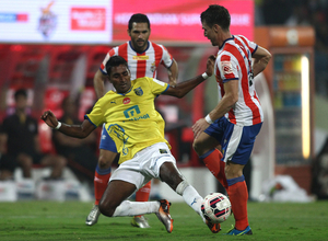 El Atlético de Kolkata supo ver ahí el hueco por donde hacer daño al Kerala y Rafi tuvo más de una ocasión de abrir el marcador con carreras buscando balones largos a la espalda de Falvei, pero James cuajó una primera parte impecable.