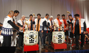 Posteriormente llegó el momento estelar con la aparición de los dos equipos con sus entrenadores a la cabeza, instante que fue acompañado con aplausos por todos los presentes. Los jugadores y técnicos tomaron asiento en el escenario mientras Hideshima Toshiyuki, alcalde de Saga, agradecía su presencia para disputar este partido. Después la presentadora invitaba a algunos de los presentes a participar en la ceremonia de bienvenida, una tradición japonesa que consiste en romper con unos mazos un tambor con sake en su interior. El presidente del Sagan Tosu bromeaba con el mazo amagando con golpear a Simeone, mientras Ignacio Trujillo, Clemente Villaverde, José Luis Pérez Caminero, Gabi, Raúl García y el propio Simeone se vestían con un kimono y tomaban un mazo para cumplir con la tradición.