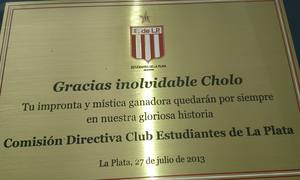 En la placa figuraba la siguiente inscripción: "Gracias inolvidable Cholo. Tu impronta y mística ganadora quedarán por siempre en nuestra gloriosa historia". El Cholo dejó huella en el club estudiantil y con ese homenaje de la directiva y el cariño que le tributó la afición antes del partido quisieron agradecer al actual técnico rojiblanco su trabajo y entrega en el tiempo en el que fue entrenador.