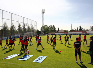 El entrenamiento, que duró una hora y quince minutos, comenzó con unos ejercicios de calentamiento dinámicos y sin balón para seguir con estiramientos para calentar todos los músculos de los jugadores. Antes de preparar la estrategia a seguir en Vigo, los jugadores, bajo las órdenes de Óscar Ortega, realizaron un ejercicio de carrera continua.