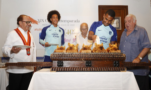 Axel Witsel, Samuel Lino, Lázaro Albarracín y Severiano Gil, además del propio José María, cortaron el cochinillo asado al tradicional estilo segoviano con los platos y posteriormente los rompieron.