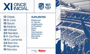 - Once del Atlético de Madrid: Oblak, Molina, Savic, Witsel, Reinildo, Lino, Barrios, De Paul, Llorente, Riquelme y Morata.