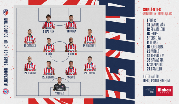 - Once del Atlético de Madrid: Oblak, Trippier, Savic, Giménez, Hermoso, Koke, Saúl, Llorente, Carrasco, Correa y João Félix.