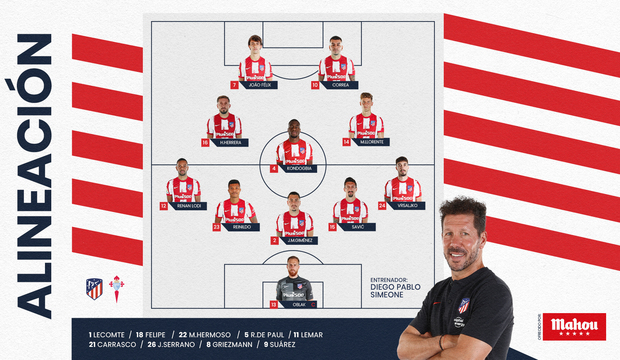 - Once titular del Atlético de Madrid: Oblak, Renan Lodi, Reinildo, Giménez, Savic, Vrsaljko, Kondogbia, Herrera, Llorente, Correa y João Félix.