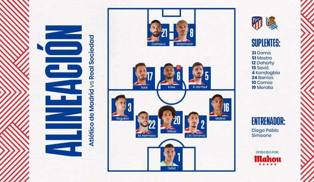 Ya conocemos las alineaciones titulares para el Atleti-Real Sociedad