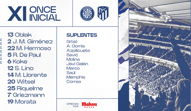 - Once del Atlético de Madrid: Oblak, Riquelme, Giménez, Witsel, Hermoso, Lino, Llorente, Koke, De Paul, Morata y Griezmann.