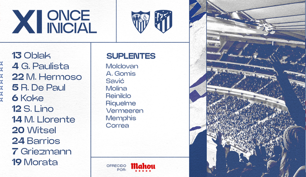- Once del Atlético de Madrid: Oblak, Llorente, Gabriel Paulista, Witsel, Hermoso, Lino, De Paul, Koke, Barrios, Griezmann y Morata.