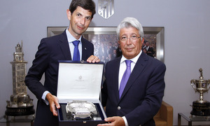 Enrique Cerezo entregó una réplica del Calderón a Alfonso Fernández 21 de agosto, 2016 - 23:40 A lo largo del campeonato liguero recién inaugurado, todos los equipos que durante esta campaña visiten el estadio Vicente Calderón recibirán una reproducción del mismo en miniatura.