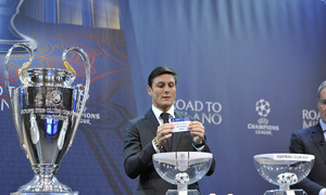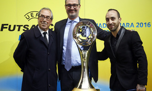 Adelardo Rodríguez y Ricardihno, jugador del Movistar Inter, sortearon durante el descanso del encuentro ante el PSV los emparejamientos de la UEFA Futsal.