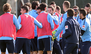 Jesús Gámez volvió a trabajar con el grupo con la máscara protectora tras la fractura nasal que sufrió hace una semana. Fue la gran novedad, además de que Simeone pudo trabajar con todos los internacionales excepto el lesionado Miranda.