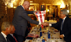 Enrique Cerezo y Miguel Ángel Gil ejercieron de anfitriones con la Directiva del PSV antes del partido de Champions League en el estadio Vicente Calderón.