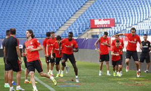 La primera plantilla se ejercitó sobre el césped del Vicente Calderón para ultimar detalles de cara al encuentro frente la UD Las Palmas. Antes del entrenamiento, Diego Pablo Simeone atendió a los medios de comunicación.